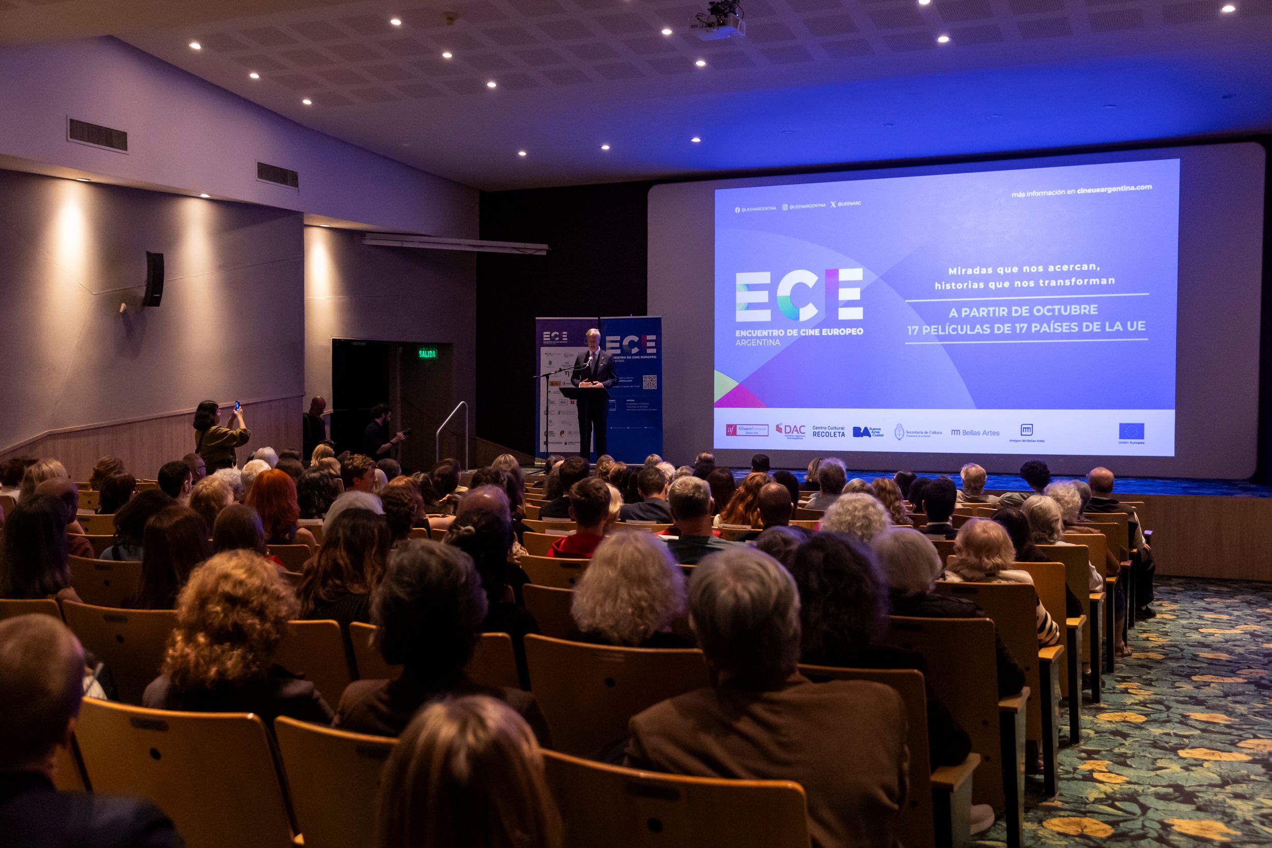 La película Under the Volcano (Polonia) fue la encargada de abrir el ECE 2025 en el Auditorio Amigos del Bellas Artes de Buenos Aires, ante un público de casi 200 personas (entre invitados y público general) y con la presencia de 9 embajadores de Estados Miembros de la UE. Días antes, la tradicional Rueda de Prensa reunió a los representantes culturales de los 17 países participantes, quienes presentaron sus películas de manera ágil y cercana, en un evento con sala llena que incluyó la proyección de Terapia Familiar (Eslovenia).